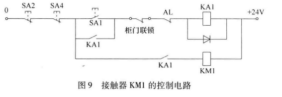 1.數控系統所用的-200V電源,是經過接觸器KM1的觸點加入的。接觸器KM1的控制電路如圖9所示。24V控制電源經急停按鈕SA2和SA4、起動按鈕SA1(或自鎖觸點KA1)、柜門聯鎖開關、觸點AL加到繼電器KA1上,KAl吸合后,KM1通電,接通數控系統的電源